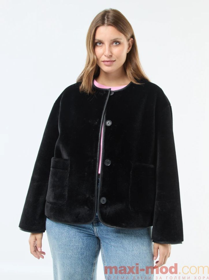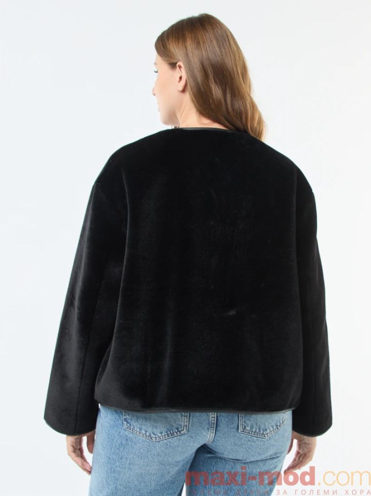 Късо дамско палто от еко кожа голям размер. Подходящо за ежедневието и свободното време.