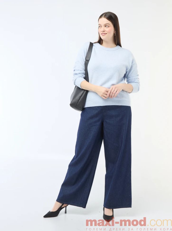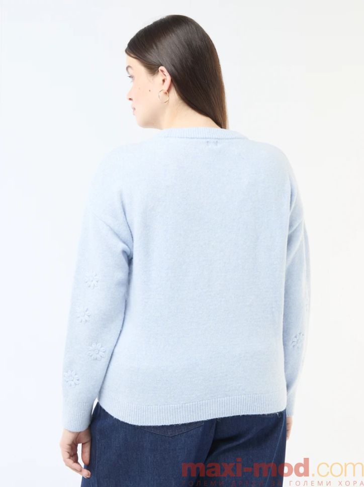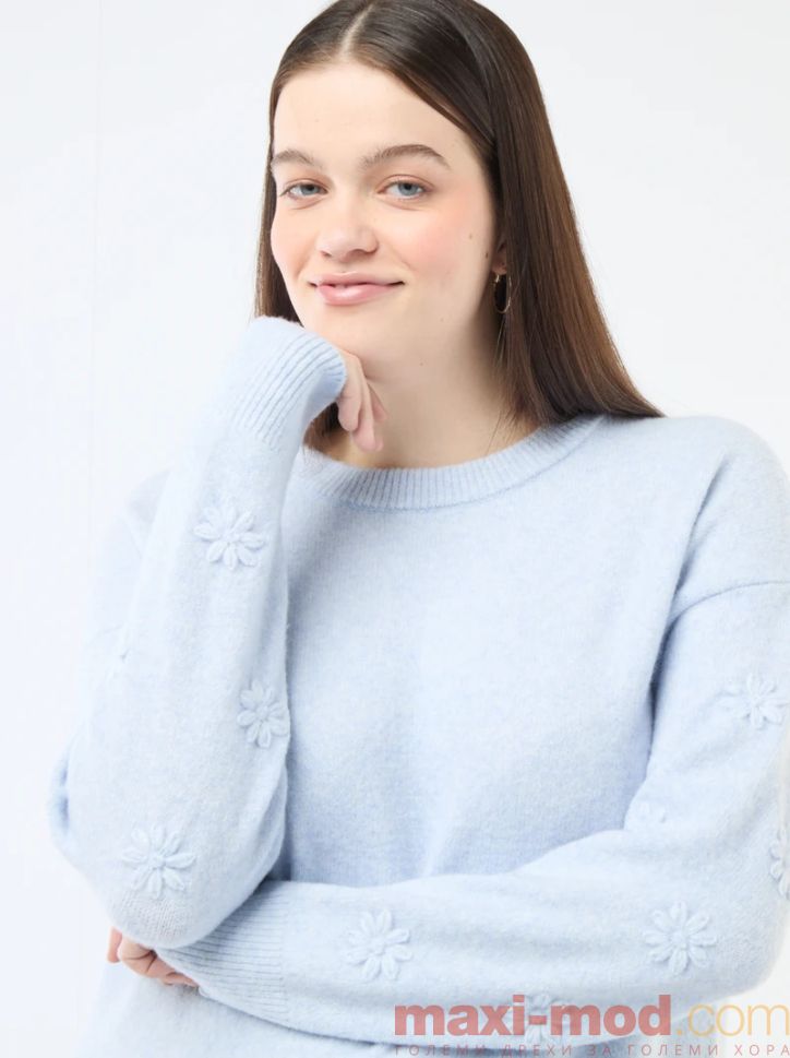 Дамски пуловер с дебела плетка с флорална бродерия. Подходяща за ежедневието и свободното време.