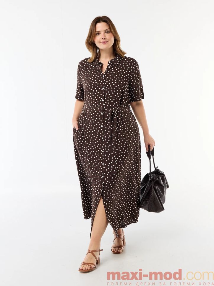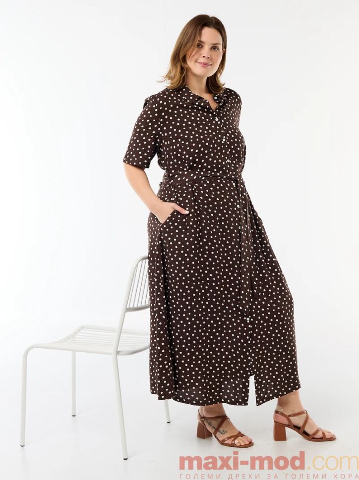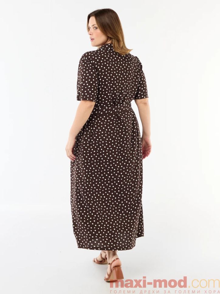 Рокля с къс ръкав и кафява на бели точки. Подходяща за ежедневието и свободното време.