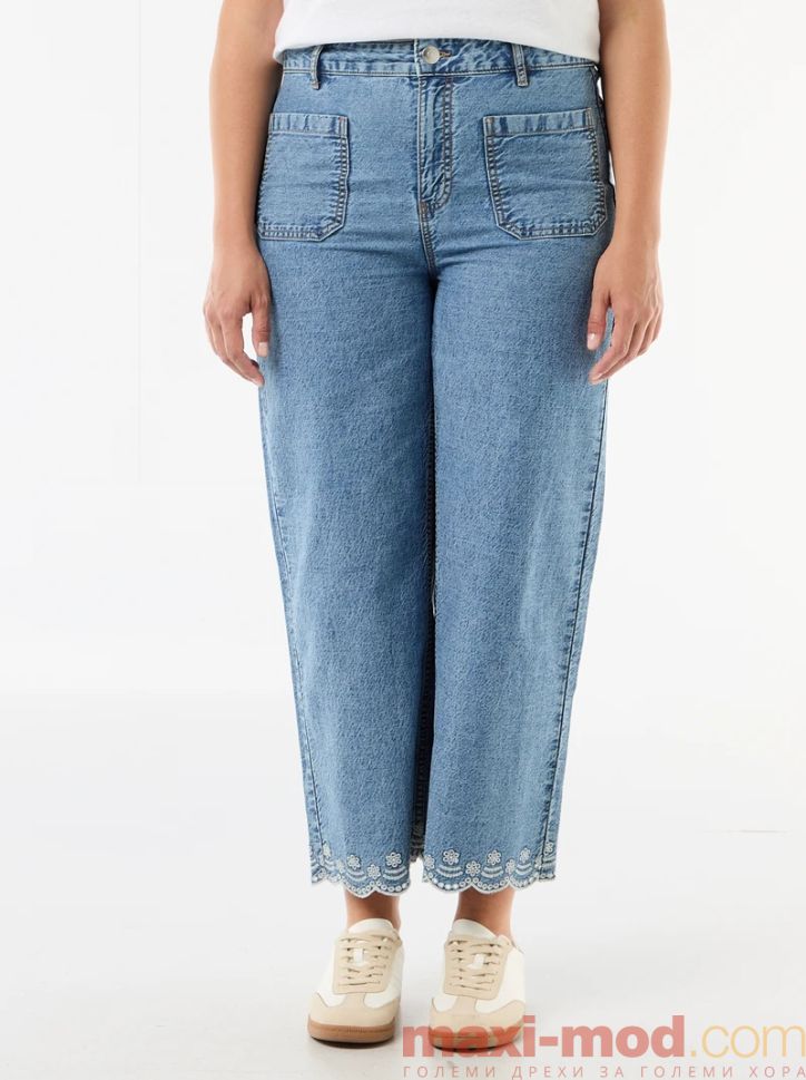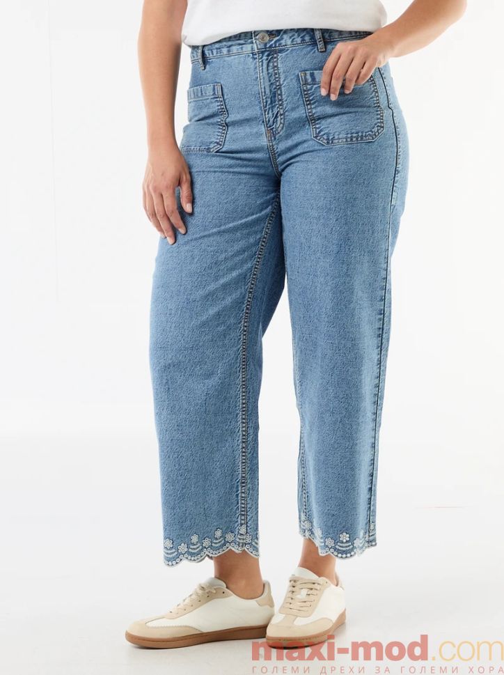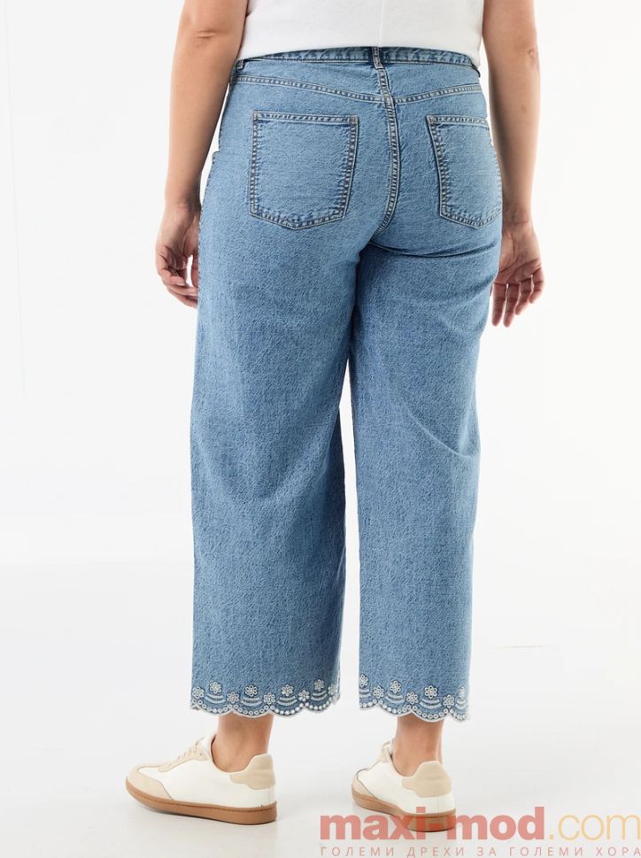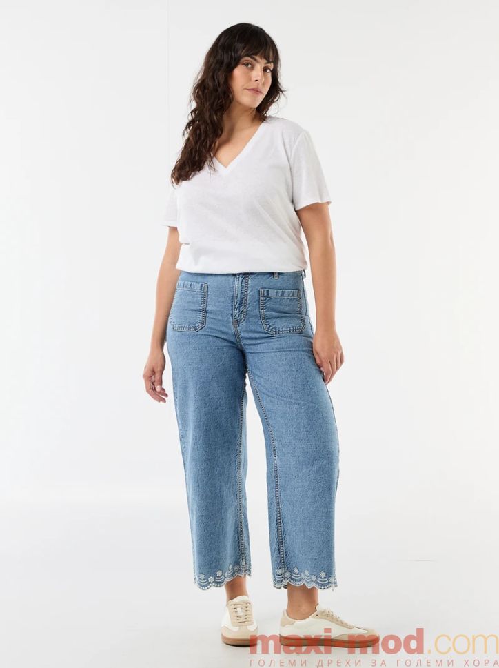 Дънки с висока талия и широки крачоли с джобове отпред. Подходящи за ежедневието и свободното време.